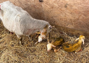 These ewes have been selected specifically for maternal, production, and out of season breeding. They make up the largest group of sheep we run. They are half Finn and half Dorset. These ewes have easily raised triplets without supplements. Some ewes have even carried quads and raised three as we allowed and bottle fed the extra. The ewes were not grained or given additional feed for number of fetuses carried.